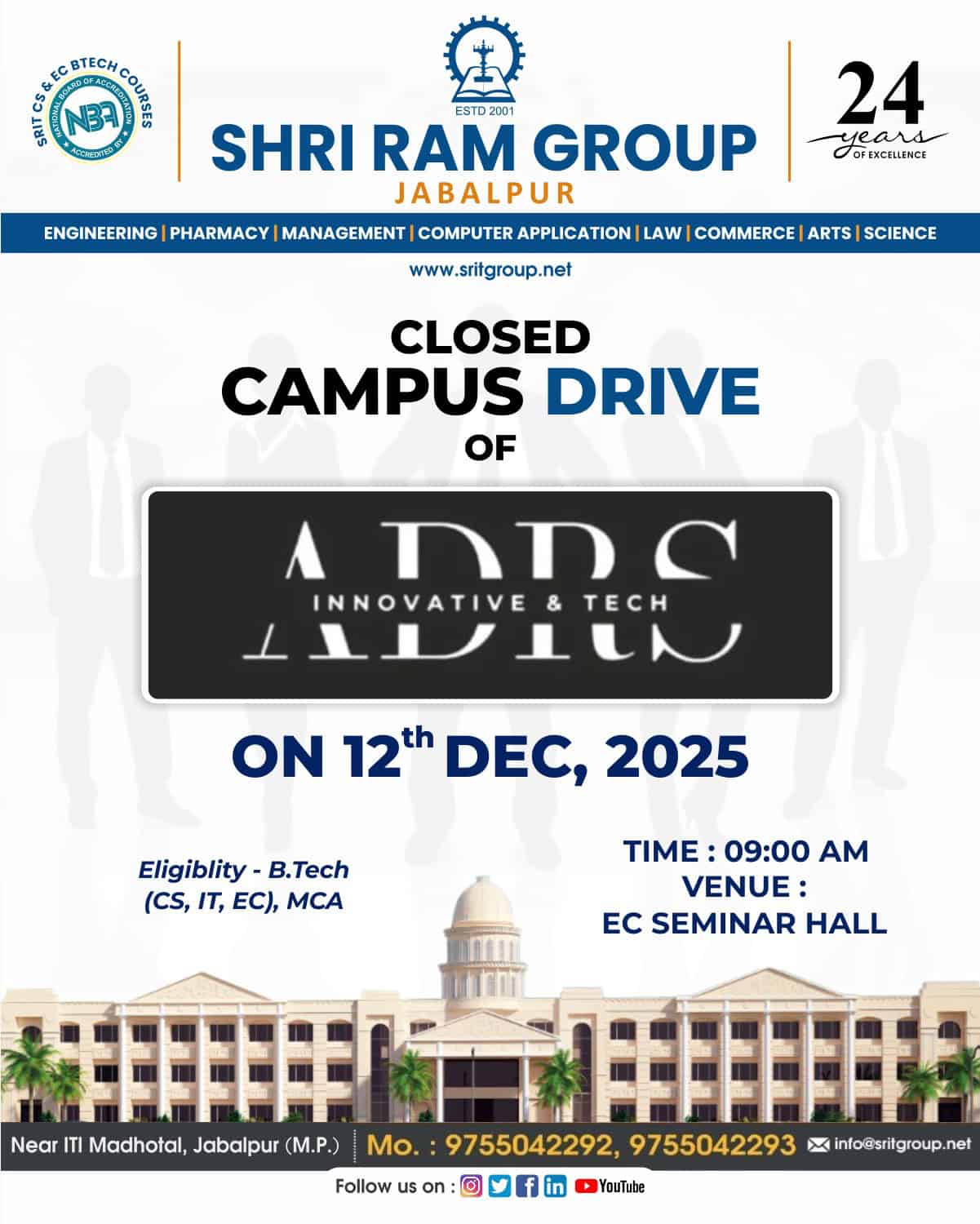Shri Ram Group, Jabalpur, successfully conducted a Closed Campus Placement Drive for ADRS Innovative & Tech on 12th Dec 2025.