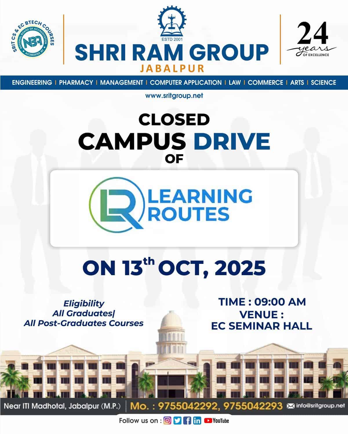 Shri Ram Group, Jabalpur, successfully organized a Closed Campus Placement Drive for Learning Routes Pvt. Ltd. on 13th October 2025.