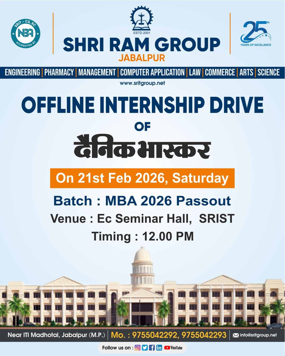Shri Ram Group, Jabalpur is organizing an Offline Internship Drive of Dainik Bhaskar for MBA 2026 Passout students. Eligible students are requested to attend the drive as per the schedule mentioned below.