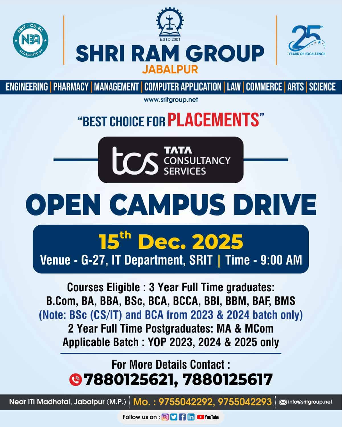 Shri Ram Group, Jabalpur, proudly recognized as the Best Choice for Placements, is organizing an Open Campus Placement Drive for Tata Consultancy Services (TCS), one of India’s leading global IT services and consulting organizations.This drive offers a valuable opportunity for eligible graduates and postgraduates to begin their careers with a prestigious multinational company.
