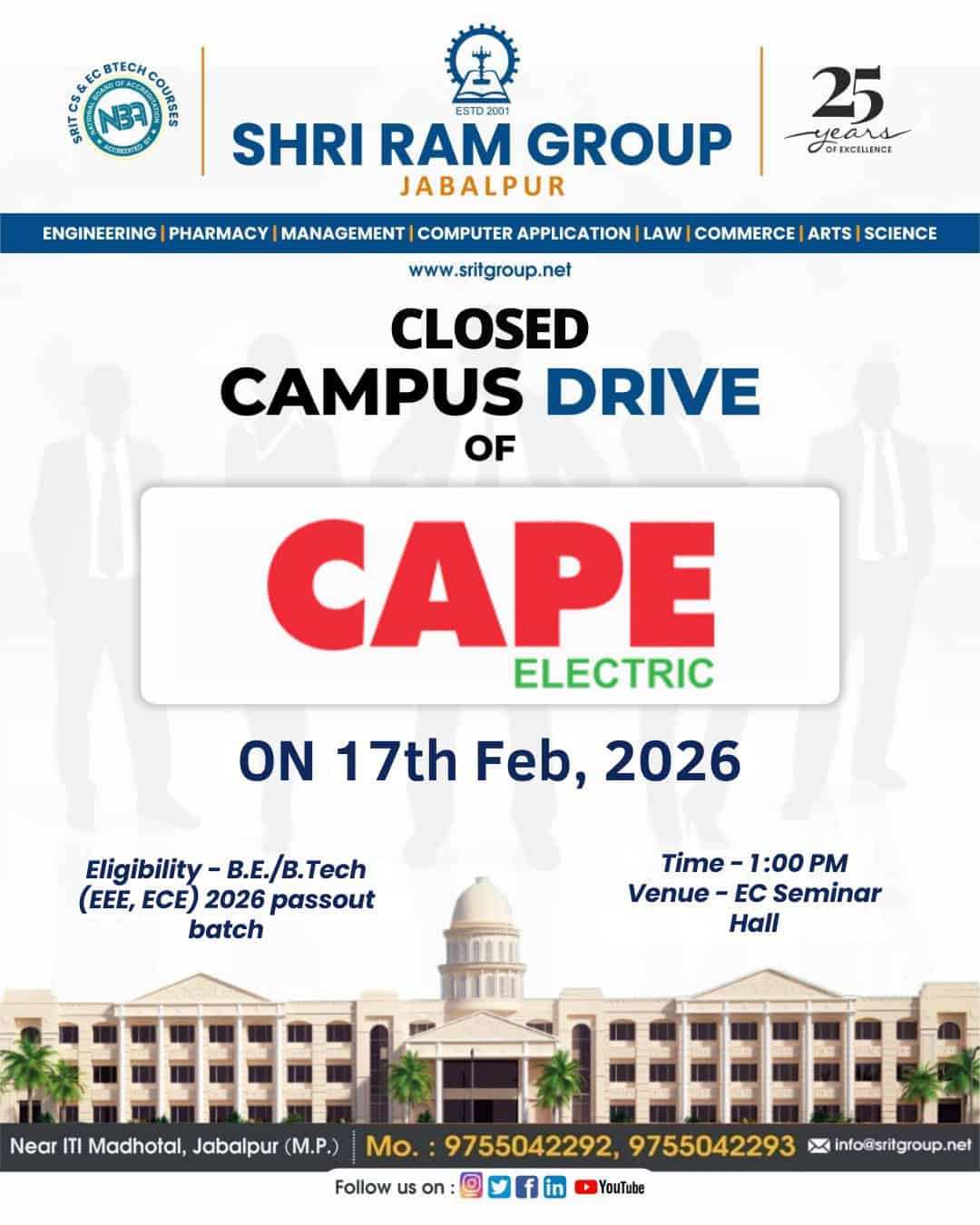 Shri Ram Group, Jabalpur is organizing a Closed Campus Placement Drive of Cape Electric for eligible final-year students. This drive offers an excellent opportunity for engineering students to begin their professional journey with a reputed organization.