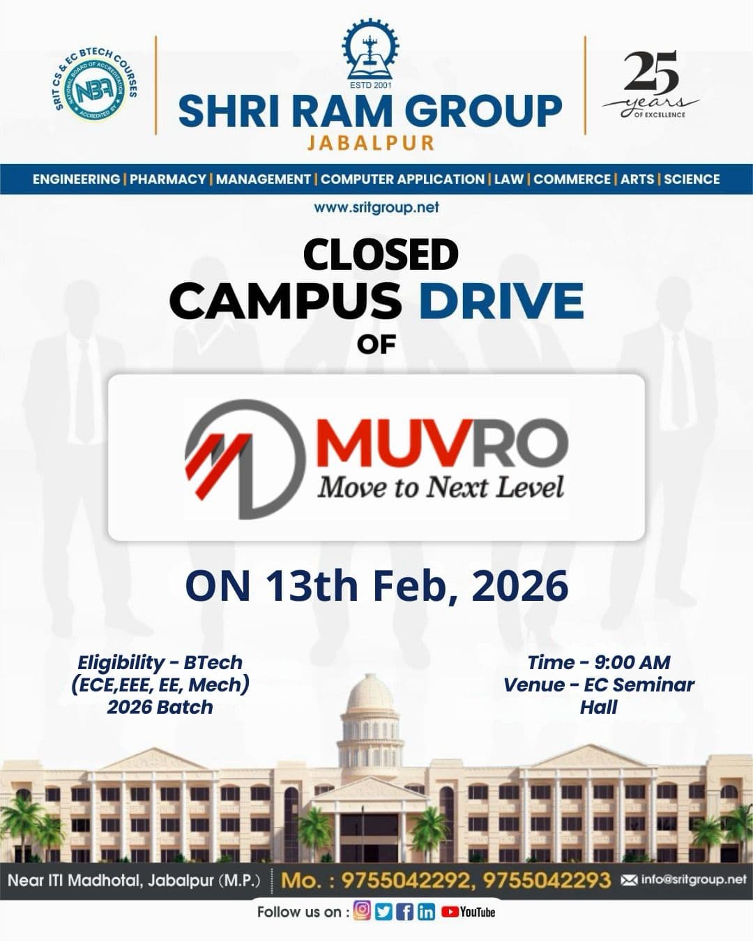 Shri Ram Group, Jabalpur, is organizing a Closed Campus Drive for MUVRO Technologies. This drive is specifically designed for the B.Tech batch of 2026 to explore career opportunities in a high-growth environment.