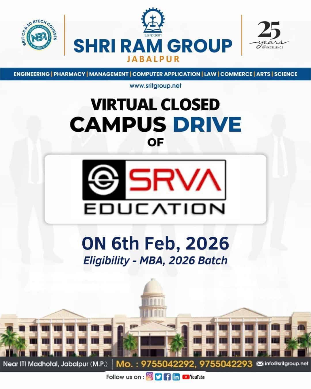 Shri Ram Group, Jabalpur is pleased to announce the Virtual Closed Campus Recruitment Drive of SRVA Education for MBA students of the 2026 batch. This virtual hiring drive offers students a valuable opportunity to begin their professional careers in the education and training sector.