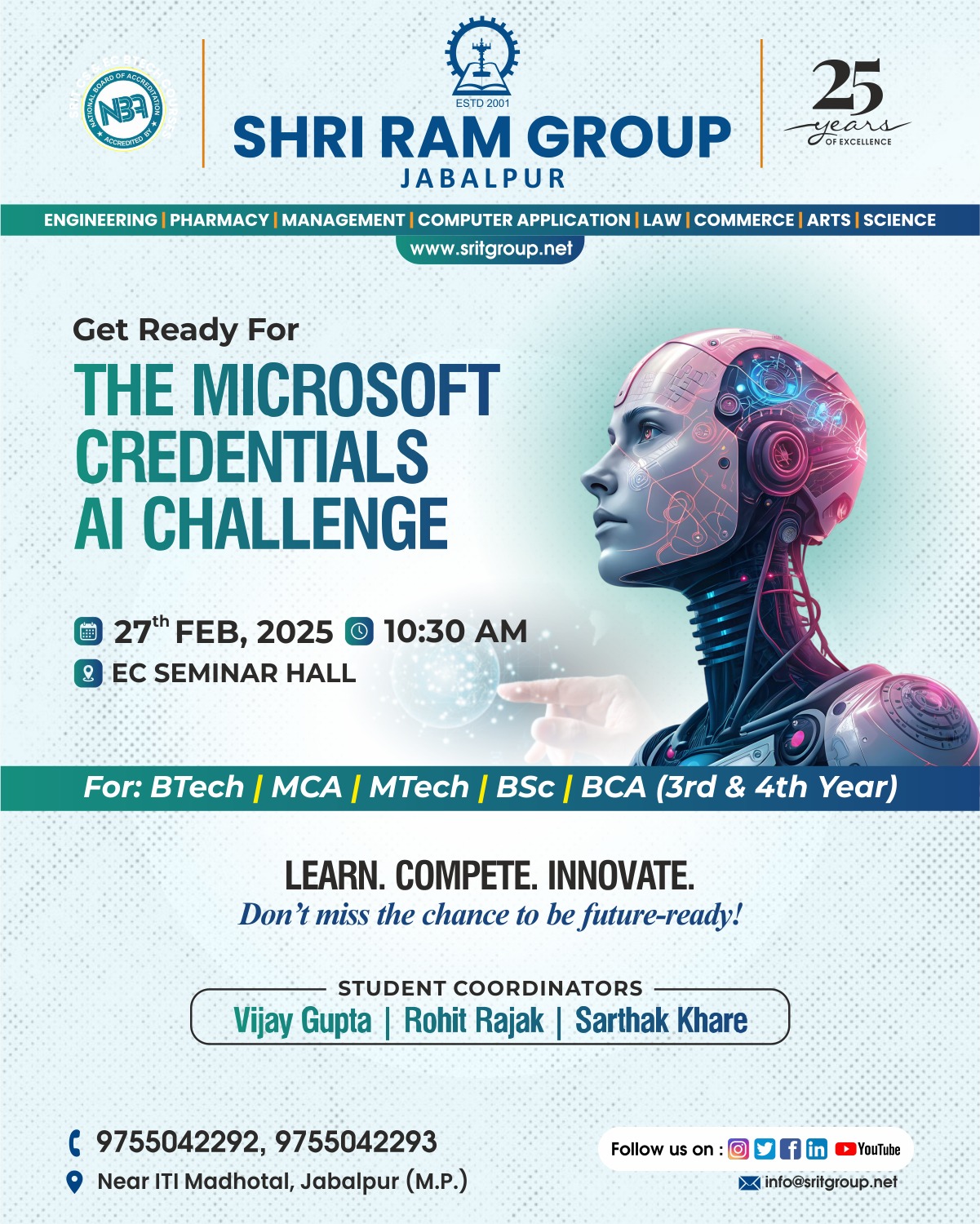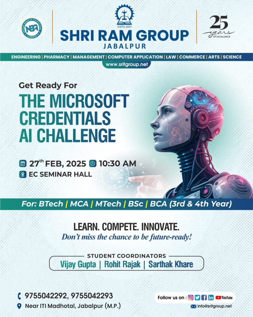 Shri Ram Group, Jabalpur is pleased to announce the Microsoft Credentials – AI Challenge 2025, a technology-driven competitive event aimed at enhancing students’ skills in Artificial Intelligence and emerging technologies.