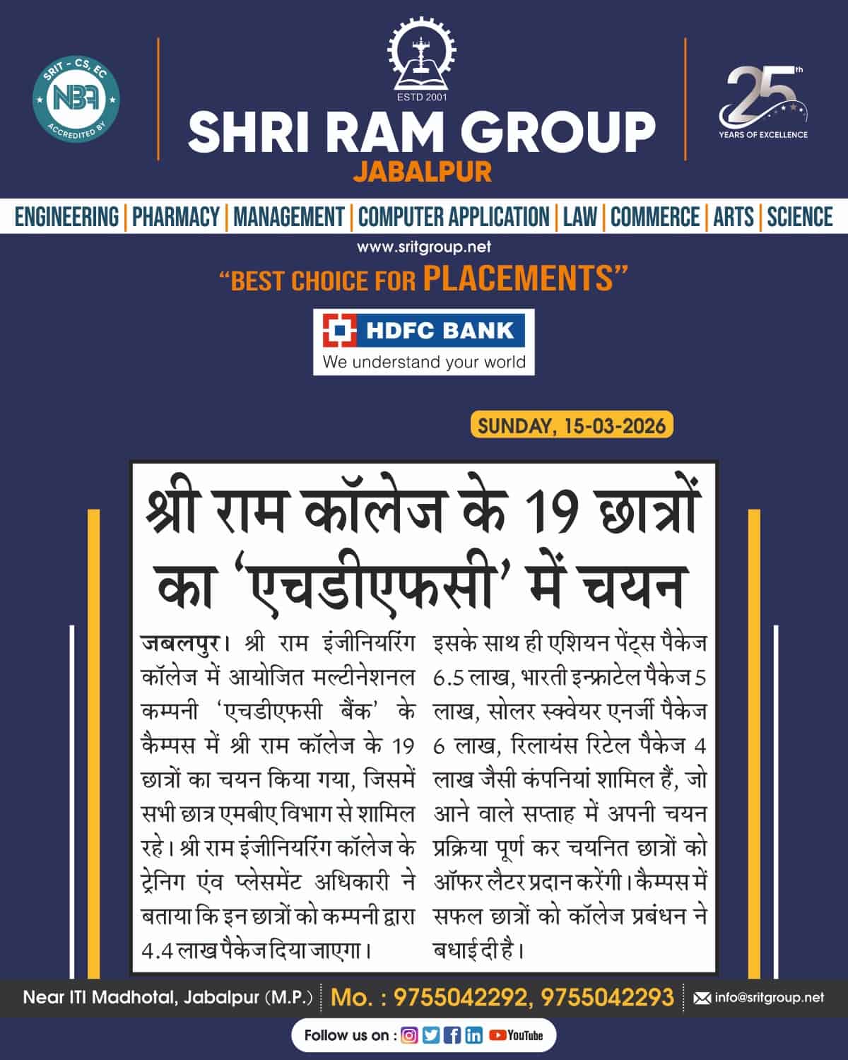 Shri Ram Group, Jabalpur proudly announces a remarkable placement achievement, where 19 students of Shri Ram College have been selected in HDFC Bank through the campus recruitment process.