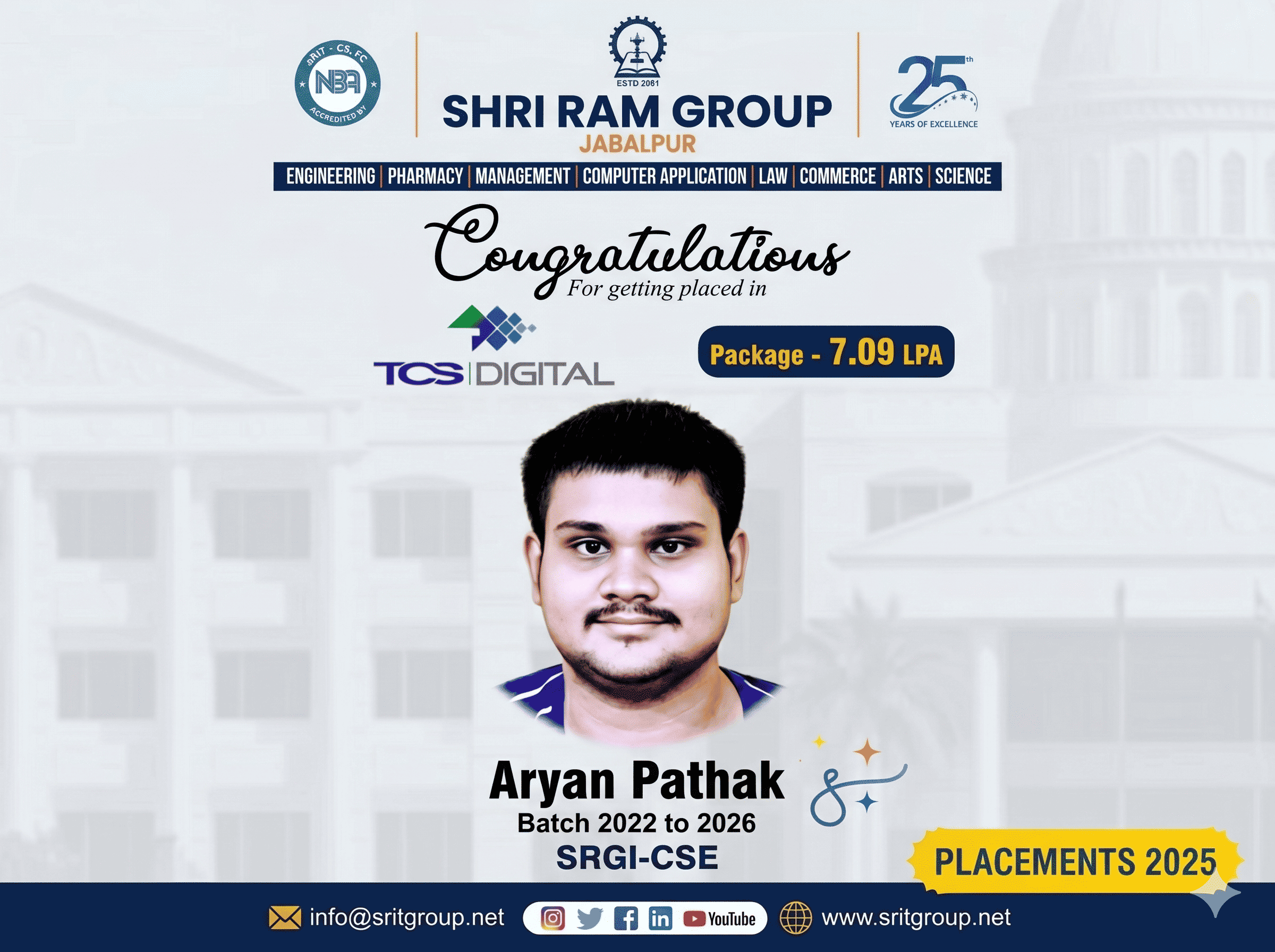 Shri Ram Group, Jabalpur proudly congratulates Aryan Pathak from the Computer Science & Engineering (CSE) department for securing a prestigious placement with TCS Digital.