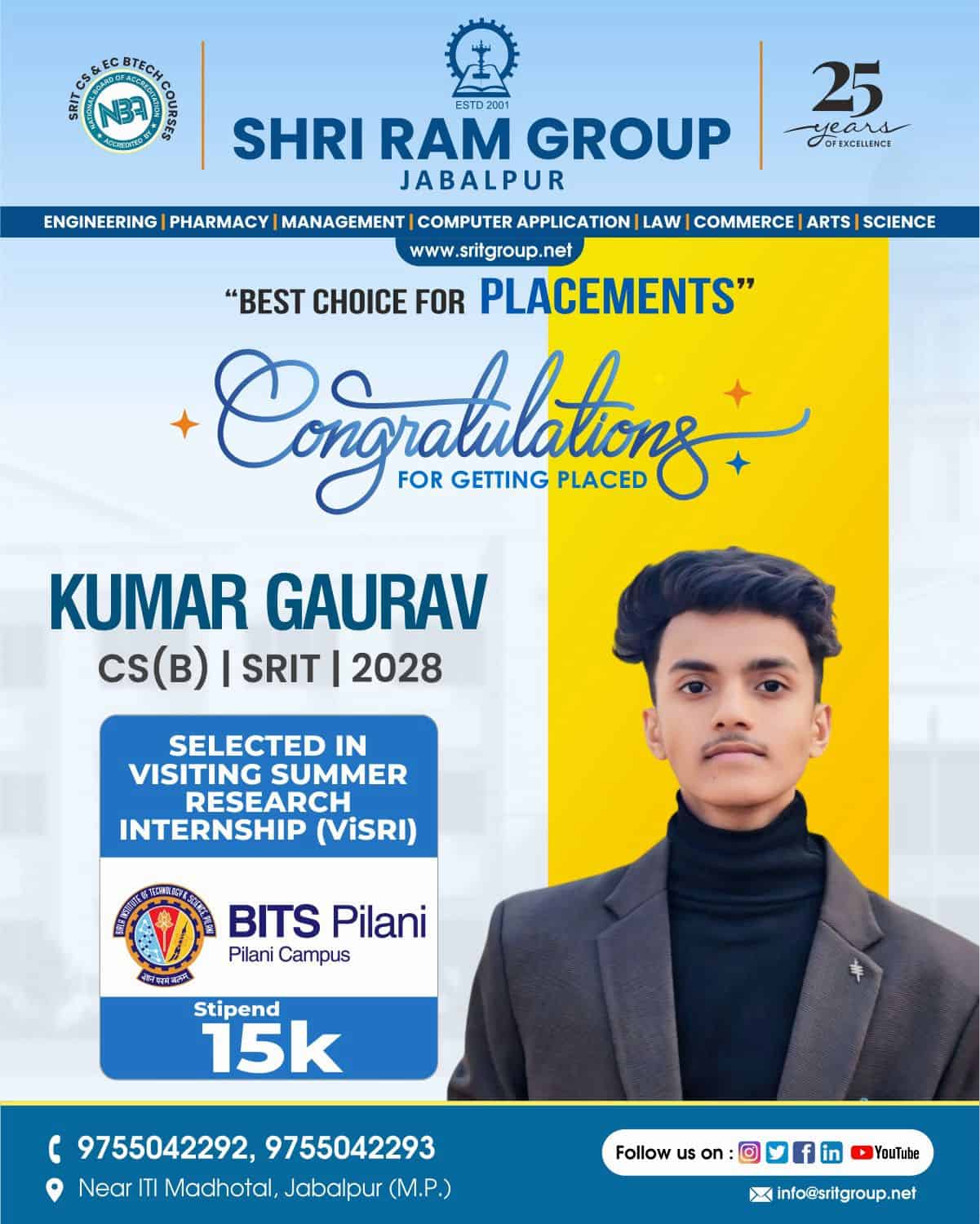Shri Ram Group, Jabalpur proudly congratulates Kumar Gaurav, a student of Computer Science (CS-B), SRIT (Batch 2028), on his outstanding achievement of being selected for the prestigious Visiting Summer Research Internship (VISRI) at BITS Pilani, Pilani Campus.
